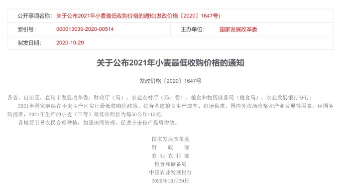 關(guān)于2021年小麥最低收購(gòu)價(jià)有關(guān)政策的通知各省、自治區(qū)、直轄市發(fā)展改革委、糧食和物資儲(chǔ)備局(糧食局)、財(cái)政廳(局)、農(nóng)業(yè)農(nóng)村廳(局、委)、農(nóng)業(yè)發(fā)展銀行分行,中國(guó)儲(chǔ)備糧管理集團(tuán)有限公司、中糧集團(tuán)有限公司、中國(guó)供銷(xiāo)集團(tuán)有限公司、中國(guó)中化集團(tuán)有限公司:為保障國(guó)家糧食安全,進(jìn)一步完善糧食最低收購(gòu)價(jià)政策,2021年繼續(xù)對(duì)最低收購(gòu)價(jià)小麥限定收購(gòu)總量?,F(xiàn)將具體事項(xiàng)通知如下。根據(jù)近幾年小麥最低收購(gòu)價(jià)收購(gòu)數(shù)量,限定2021年最低收購(gòu)價(jià)小麥?zhǔn)召?gòu)總量為3700萬(wàn)噸。(一)分批下達(dá)。限定收購(gòu)總量分兩批次下達(dá),第一批數(shù)量為3330萬(wàn)噸,不分配到省;第二批數(shù)量為370萬(wàn)噸,視收購(gòu)需要具體分配到省。當(dāng)最低收購(gòu)價(jià)全國(guó)收購(gòu)總量達(dá)到第一批數(shù)量的90%時(shí),中儲(chǔ)糧有關(guān)分公司應(yīng)會(huì)同省級(jí)糧食等部門(mén)單位及時(shí)提出本省第二批收購(gòu)的計(jì)劃數(shù)量建議。中儲(chǔ)糧集團(tuán)公司根據(jù)當(dāng)年小麥產(chǎn)量、收購(gòu)量、農(nóng)戶余糧和市場(chǎng)價(jià)格等情況統(tǒng)籌平衡各省數(shù)量后,報(bào)國(guó)家糧食和物資儲(chǔ)備局批準(zhǔn)。國(guó)家糧食和物資儲(chǔ)備局通過(guò)政府網(wǎng)站公布各省第二批收購(gòu)數(shù)量。在第一批收購(gòu)?fù)瓿珊?,有關(guān)省份按照批準(zhǔn)的第二批數(shù)量繼續(xù)開(kāi)展收購(gòu)。當(dāng)收購(gòu)量達(dá)到本省批準(zhǔn)數(shù)量時(shí),立即停止該省最低收購(gòu)價(jià)收購(gòu)且不再啟動(dòng)。(二)動(dòng)態(tài)監(jiān)測(cè)。啟動(dòng)最低收購(gòu)價(jià)執(zhí)行預(yù)案后,中儲(chǔ)糧集團(tuán)公司要嚴(yán)格按照預(yù)案有關(guān)規(guī)定,加強(qiáng)統(tǒng)計(jì)監(jiān)測(cè),每五日向國(guó)家糧食和物資儲(chǔ)備局報(bào)送收購(gòu)進(jìn)度;啟動(dòng)第二批收購(gòu)后,中儲(chǔ)糧集團(tuán)公司要按日?qǐng)?bào)送收購(gòu)進(jìn)度。國(guó)家糧食和物資儲(chǔ)備局定期通過(guò)政府網(wǎng)站公布最低收購(gòu)價(jià)全國(guó)收購(gòu)總量。省級(jí)糧食等有關(guān)部門(mén)要結(jié)合小麥商品量和農(nóng)戶余糧情況,及時(shí)開(kāi)展調(diào)研調(diào)度,全面掌握收糧進(jìn)度。(一)認(rèn)真落實(shí)限量收購(gòu)政策。中儲(chǔ)糧集團(tuán)公司作為最低收購(gòu)價(jià)政策執(zhí)行主體,要嚴(yán)格執(zhí)行限定收購(gòu)總量的收購(gòu)政策,不得超量收購(gòu)。財(cái)政資金支持限于最低收購(gòu)價(jià)政策下的最高收購(gòu)總量?jī)?nèi)。(二)加強(qiáng)市場(chǎng)監(jiān)管。各地要認(rèn)真落實(shí)糧食收儲(chǔ)制度改革精神,規(guī)范糧食流通市場(chǎng)秩序,依法依規(guī)嚴(yán)厲查處糧食收儲(chǔ)過(guò)程中的違法違規(guī)行為。(三)促進(jìn)“優(yōu)糧優(yōu)價(jià)”。各地要積極鼓勵(lì)農(nóng)企對(duì)接,充分發(fā)揮市場(chǎng)價(jià)格對(duì)生產(chǎn)的反饋引導(dǎo)作用,促進(jìn)種植結(jié)構(gòu)調(diào)整優(yōu)化,增加綠色優(yōu)質(zhì)安全產(chǎn)品供給。