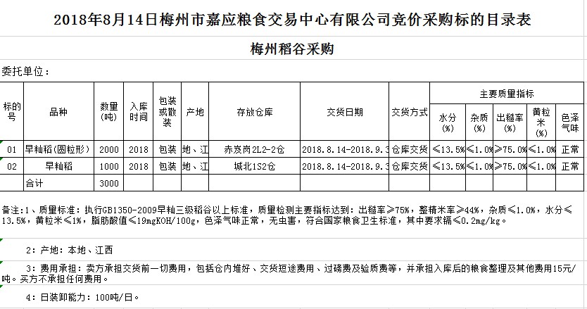 交易時間和地點:2018年8月14日(星期二)上午10時15分。廣東省梅州市彬芳大道南161號梅州市糧食交易中心3樓。