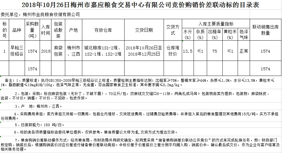 交易時間和地點:2018年10月26日(星期五)上午10時。廣東省梅州市彬芳大道南161號梅州市糧食交易中心3樓。