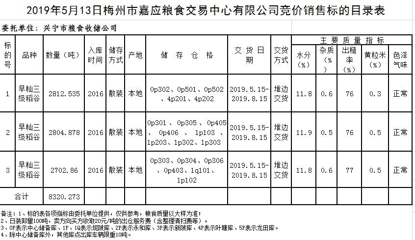 受客戶委托,梅州市嘉應糧食交易中心有限公司定于2019年5月13日(星期一)舉辦糧食競價交易會,興寧市糧食收儲公司擬銷售2016年早秈稻8320.273噸。