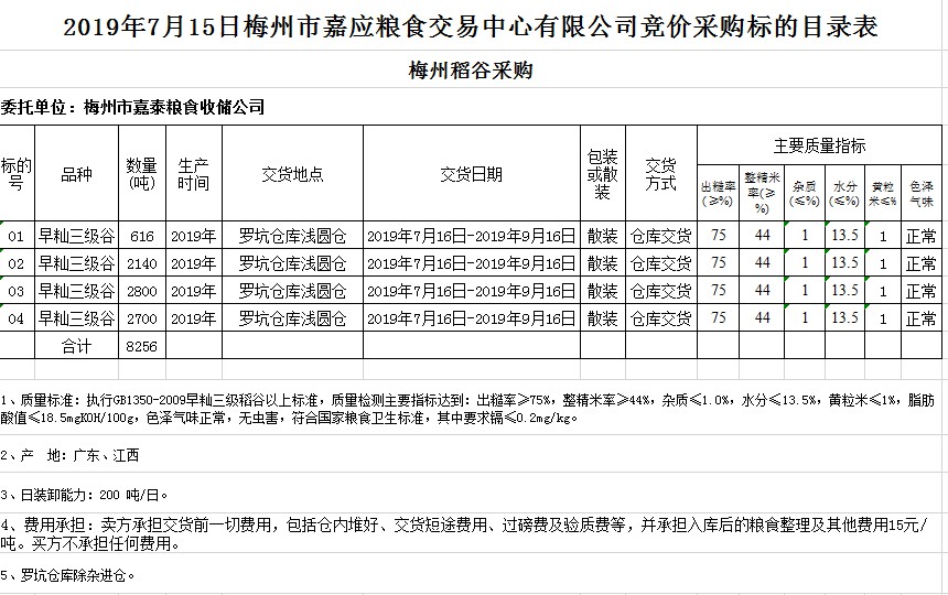 受客戶委托,梅州市嘉應(yīng)糧食交易中心有限公司定于2019年7月15日(星期一)舉辦糧食競價(jià)交易會,梅州市嘉泰糧食收儲公司擬采購2019年早秈稻8256噸。