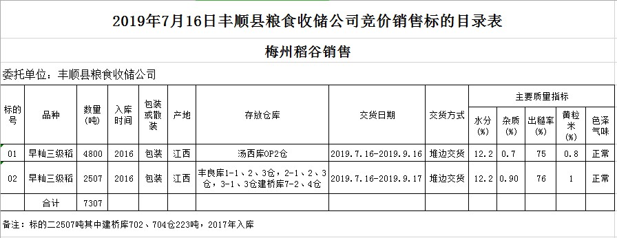 受客戶委托,梅州市嘉應(yīng)糧食交易中心有限公司定于2019年7月16日(星期二)舉辦糧食競價交易會,豐順縣糧食收儲公司擬銷售2016年早秈稻7084噸2017年早秈稻223噸。
