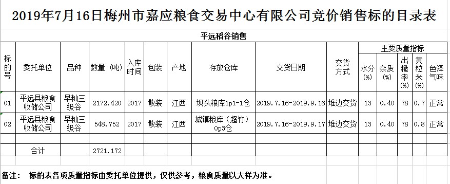 受客戶委托,梅州市嘉應(yīng)糧食交易中心有限公司定于20197月16日(星期二)舉辦糧食競(jìng)價(jià)交易會(huì),平遠(yuǎn)縣糧食收儲(chǔ)公司擬銷售2017年早秈稻2721.172噸。