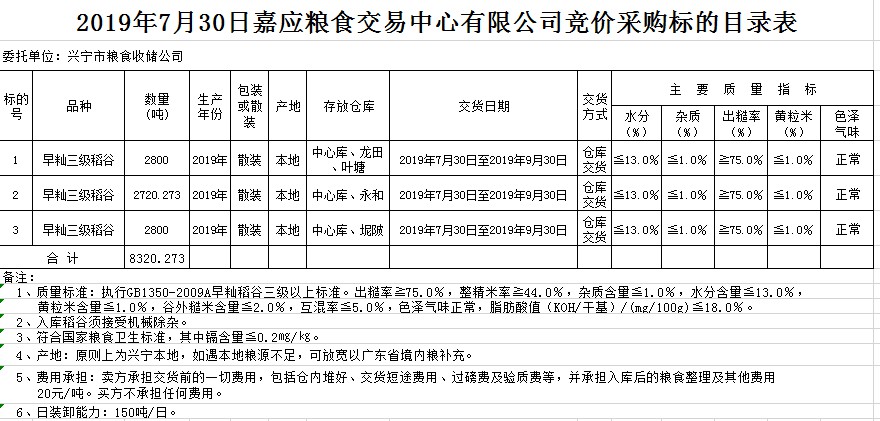受客戶委托,梅州市嘉應糧食交易中心有限公司定于2019年7月30日(星期二)舉辦糧食競價交易會,興寧市糧食收儲公司擬采購2019年早秈稻8320.273噸。