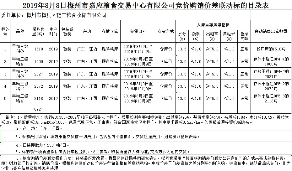 交易時間和地點(diǎn):20198月8日(星期四)上午10。廣東省梅州市彬芳大道南161號梅州市糧食交易中心3樓。