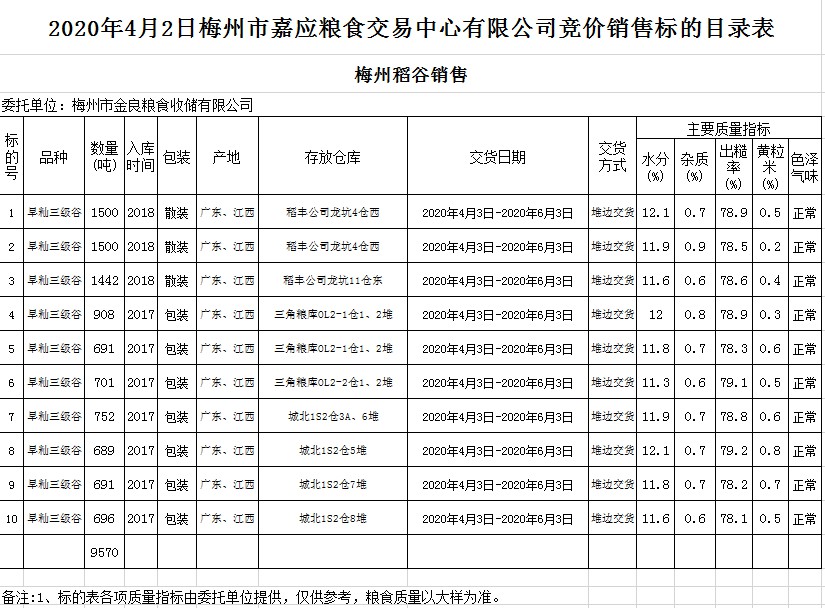 交易時間和地點:2020年4月2日(星期四)上午10時。廣東省梅州市彬芳大道南161號梅州市糧食交易中心3樓。