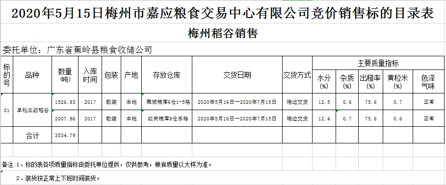 受客戶委托,梅州市嘉應糧食交易中心有限公司定于2020年5月15日(星期五)舉辦糧食競價交易會,廣東省蕉嶺縣糧食收儲公司擬銷售2017年早秈稻3534.79噸。