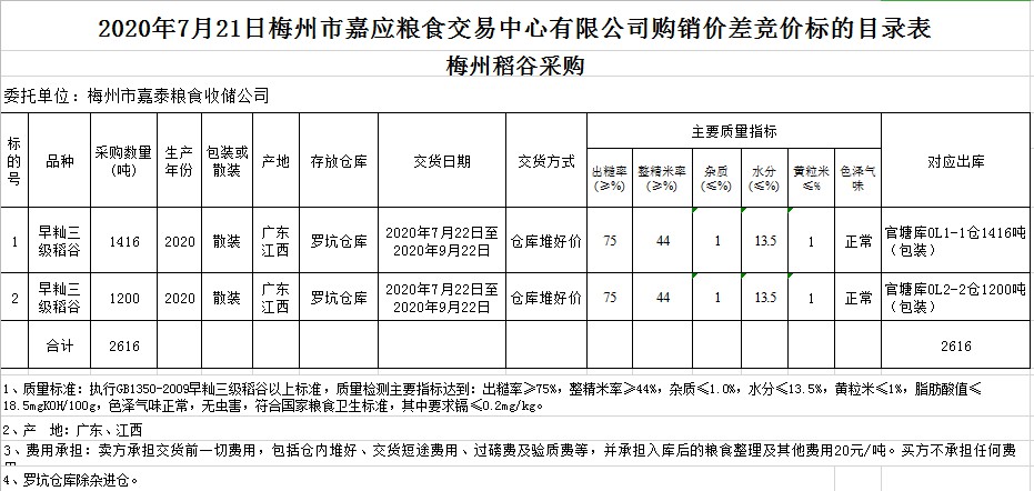 受客戶委托,梅州市嘉應(yīng)糧食交易中心有限公司定于2020年7月21日(星期二)舉辦稻谷購銷價(jià)差聯(lián)動(dòng)標(biāo)的交易會(huì),梅州市嘉泰糧食收儲(chǔ)公司擬銷售和采購早秈稻2616噸。