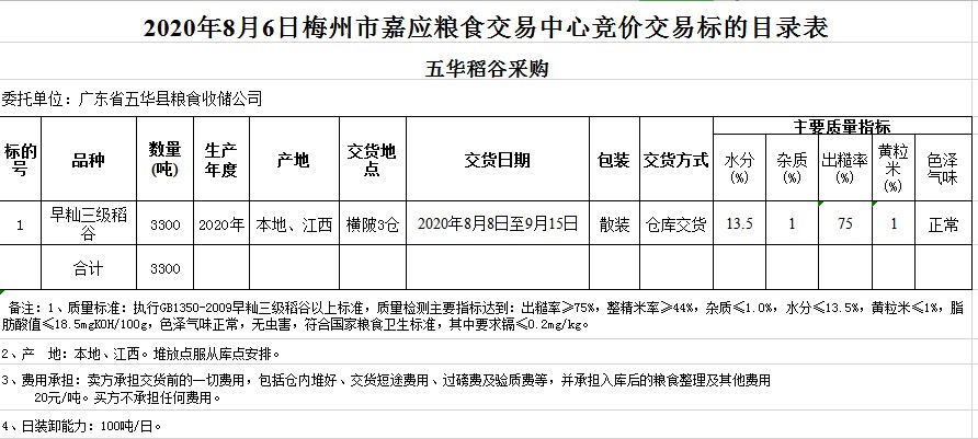 2020年8月6日廣東省五華縣糧食收儲(chǔ)公司稻谷采購(gòu)