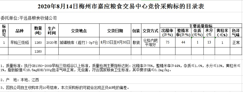 交易時(shí)間和地點(diǎn):20208月14日(星期五)上午10時(shí)。廣東省梅州市彬芳大道南161號(hào)梅州市糧食交易中心3樓。