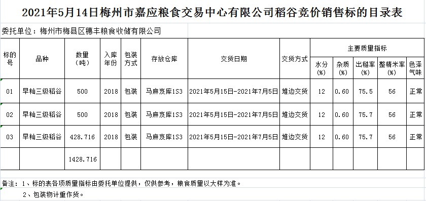 受客戶委托,梅州市嘉應(yīng)糧食交易中心有限公司定于2021年5月14日(星期五)舉辦糧食競價(jià)交易會(huì)。梅州市梅縣區(qū)穗豐糧食收儲(chǔ)有限公司擬銷售2018年早秈稻1428.716噸。