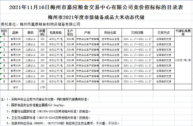 受客戶委托,梅州市嘉應(yīng)糧食交易中心有限公司定于2021年11月16日(星期二)上午10時在廣東省梅州市彬芳大道南161號梅州市糧食交易中心3樓,舉辦梅州市市級儲備成品糧油新一輪動態(tài)代儲采購及包干輪換費公開招標(biāo)。