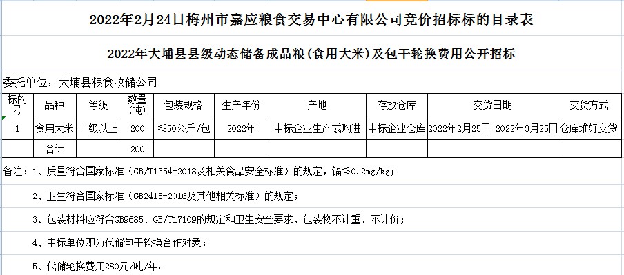 2022年大埔縣縣級(jí)動(dòng)態(tài)儲(chǔ)備成品糧(食用大米)及包干輪換費(fèi)用公開(kāi)招標(biāo)公告