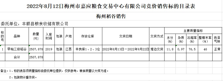 受客戶委托,梅州市嘉應(yīng)糧食交易中心有限公司定于2022年8月12日(星期五)舉辦糧食競價(jià)交易會。豐順縣糧食收儲有限公司擬銷售2019年早秈稻2507.878噸。