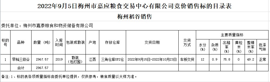 受客戶(hù)委托,梅州市嘉應(yīng)糧食交易中心有限公司定于2022年9月5日(星期一)舉辦糧食競(jìng)價(jià)交易會(huì)。梅州市嘉泰糧食和物資儲(chǔ)備有限公司擬銷(xiāo)售2019年早秈稻2967.57噸。