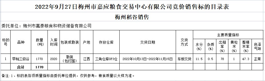 2022年9月27日梅州市嘉泰糧食和物資儲(chǔ)備有限公司稻谷銷售