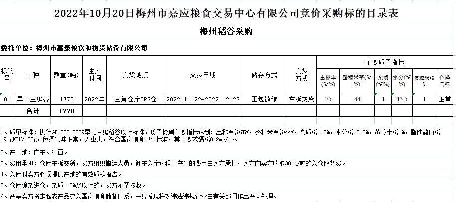 受客戶委托,梅州市嘉應(yīng)糧食交易中心有限公司定于2022年10月20日(星期四)舉辦糧食競價交易會。梅州市嘉泰糧食和物資儲備有限公司擬采購2022年早秈稻1770噸。