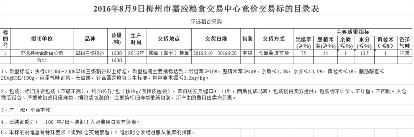 受客戶委托,梅州市嘉應糧食交易中心有限公司定于2016年8月9日舉辦糧食競價交易會,平遠縣糧食收儲公司擬采購2016年產(chǎn)早秈三級稻谷1630噸。
