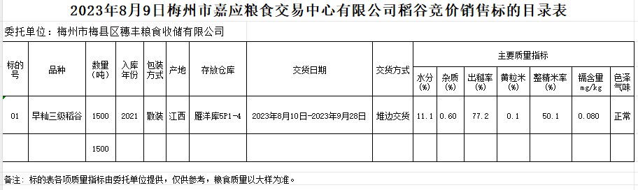 2023年8月9日梅州市梅縣區(qū)穗豐糧食收儲有限公司稻谷銷售