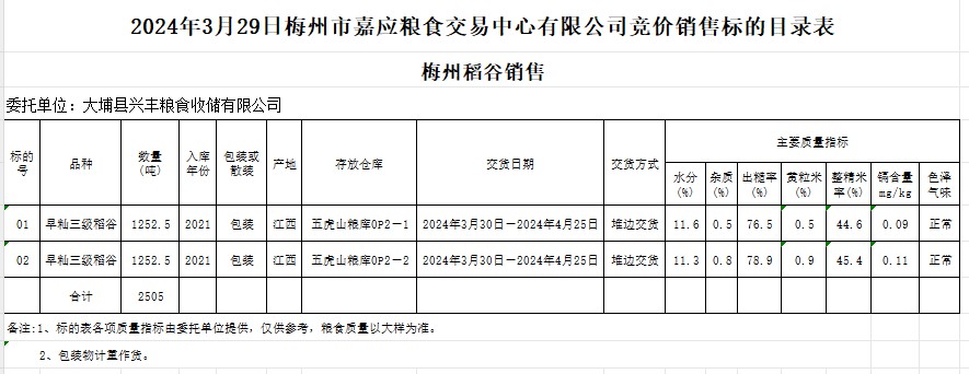 受客戶委托,梅州市嘉應糧食交易中心有限公司定于2024年3月29日(星期五)舉辦糧食競價交易會。大埔縣興豐糧食收儲有限公司擬銷售2021年早秈稻2505噸。