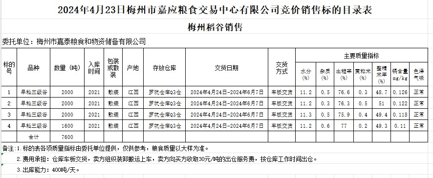 受客戶委托,梅州市嘉應(yīng)糧食交易中心有限公司定于2024年4月23日(星期二)舉辦糧食競(jìng)價(jià)交易會(huì)。梅州市嘉泰糧食和物資儲(chǔ)備有限公司擬銷售2021年產(chǎn)早秈稻7600噸。