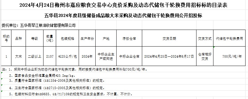五華縣2024年度縣級儲備成品糧大米采購及動態(tài)代儲包干輪換費用公開招標(biāo)公告