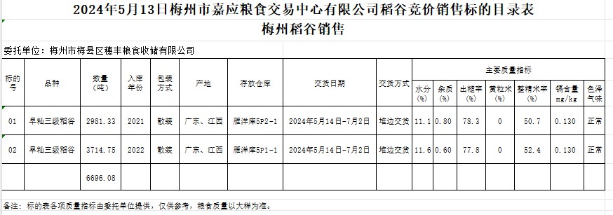 受客戶委托,梅州市嘉應(yīng)糧食交易中心有限公司定于2024年5月13日(星期一)舉辦糧食競(jìng)價(jià)交易會(huì)。梅州市梅縣區(qū)穗豐糧食收儲(chǔ)有限公司擬銷售2021年、2022年產(chǎn)早秈稻6696.08噸。