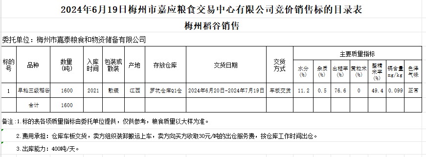 受客戶委托,梅州市嘉應糧食交易中心有限公司定于2024年6月19日(星期三)舉辦糧食競價交易會。梅州市嘉泰糧食和物資儲備有限公司擬銷售2021年產(chǎn)早秈稻1600噸。