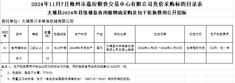 大埔縣2024年縣級儲備食用植物油采購及包干輪換費用公開招標(biāo)公告