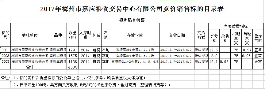 受客戶委托,梅州市嘉應糧食交易中心有限公司定于2017年4月7日舉辦糧食競價交易會,梅州市嘉泰糧食收儲公司擬銷售早秈三級稻谷4504噸。