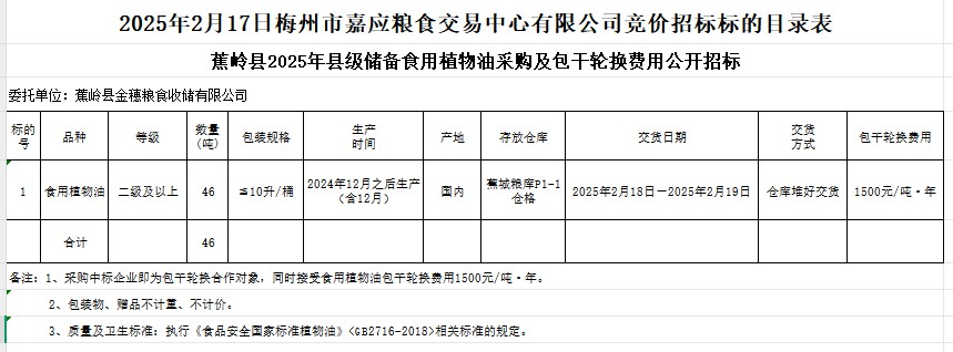 受蕉嶺縣金穗糧食收儲有限公司委托,梅州市嘉應糧食交易中心有限公司定于2025年2月17日(星期一)上午10:00在廣東省梅州市彬芳大道南161號梅州市糧食交易中心3樓,舉辦蕉嶺縣2025年縣級儲備食用植物油采購及包干輪換費用公開招標。