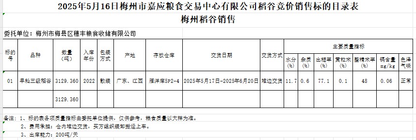 受客戶委托,梅州市嘉應糧食交易中心有限公司定于2025年5月16日(星期五)舉辦糧食競價交易會。梅州市梅縣區(qū)穗豐糧食收儲有限公司擬銷售2022年產早秈稻谷3129.360噸。