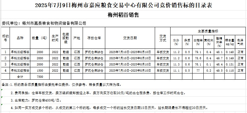 受客戶委托,梅州市嘉應(yīng)糧食交易中心有限公司定于2025年7月9日(星期三)舉辦糧食競價(jià)交易會。梅州市嘉泰糧食和物資儲備有限公司擬銷售2022年產(chǎn)早秈稻谷7500噸。