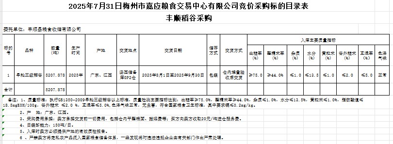受客戶委托,梅州市嘉應糧食交易中心有限公司定于2025年7月31日(星期四)舉辦糧食競價交易會。豐順縣糧食收儲有限公司擬采購2025年產(chǎn)早秈稻谷5207.878噸。
