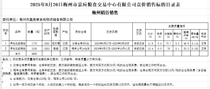 受客戶委托,梅州市嘉應(yīng)糧食交易中心有限公司定于2025年8月26日(星期二)舉辦糧食競價交易會。梅州市嘉泰糧食和物資儲備有限公司擬銷售2022年、2023年產(chǎn)早秈稻谷4920噸。