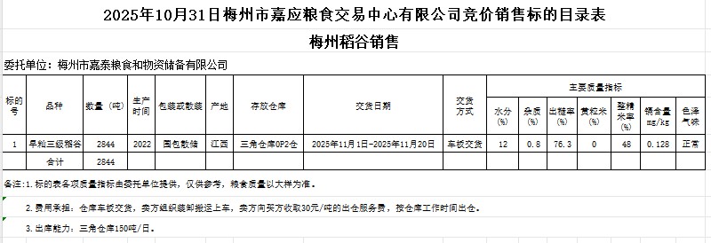 受客戶委托,梅州市嘉應糧食交易中心有限公司定于2025年10月31日(星期五)舉辦糧食競價交易會。梅州市嘉泰糧食和物資儲備有限公司擬銷售2022年產早秈稻谷2844噸。
