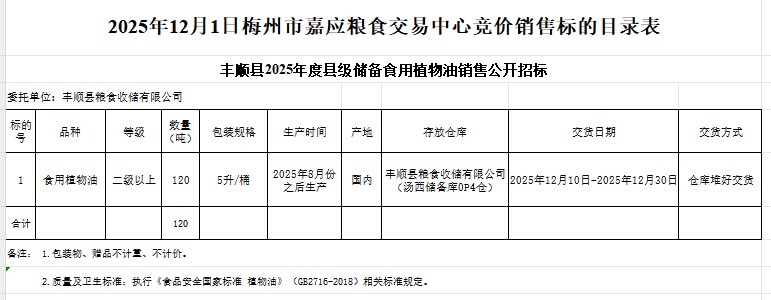 受客戶委托,梅州市嘉應(yīng)糧食交易中心有限公司定于2025年12月1日(星期一)舉辦糧食競(jìng)價(jià)交易會(huì)。豐順縣糧食收儲(chǔ)有限公司擬銷售2025年食用植物油120噸。