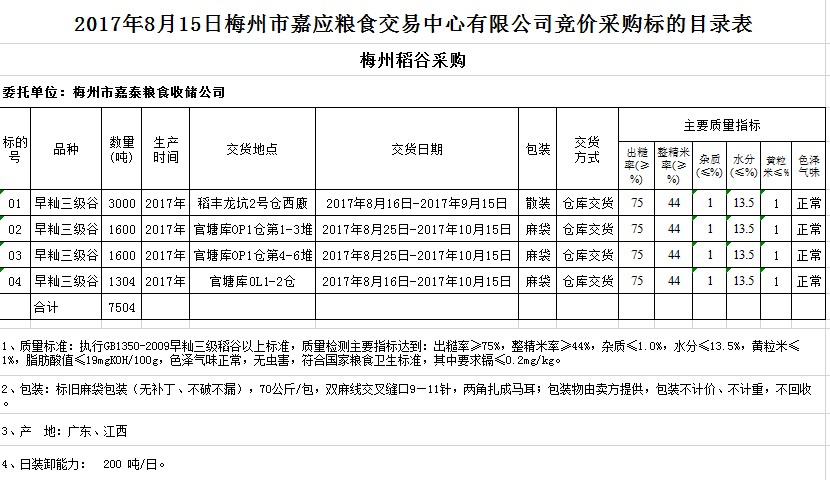 2017年8月15日梅州市嘉泰糧食收儲公司稻谷采購