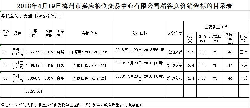 受客戶委托,梅州市嘉應(yīng)糧食交易中心有限公司定于2018年4月19日(星期四)舉辦糧食競(jìng)價(jià)交易會(huì),大埔縣糧食收儲(chǔ)公司擬銷售早秈稻5928.164噸。