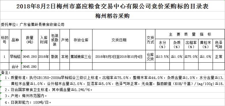 受客戶委托,梅州市嘉應糧食交易中心有限公司定于2018年8月2日舉辦糧食競價交易會,廣東省蕉嶺縣糧食收儲公司擬采購2018年產(chǎn)早秈三級稻谷3645.28噸。